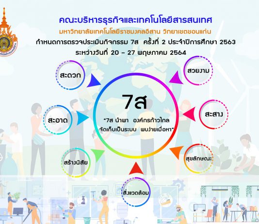 คณะบริหารธุรกิจและเทคโนโลยีสารสนเทศมหาวิทยาลัยเทคโนโลยีราชมงคลอีสาน วิทยาเขตขอนแก่น กำหนดการตรวจประเมินกิจกรรม 7ส ครั้งที่ 2 ประจำปีการศึกษา 2564 ระหว่างวันที่ 28 - 30 มีนาคม 2565